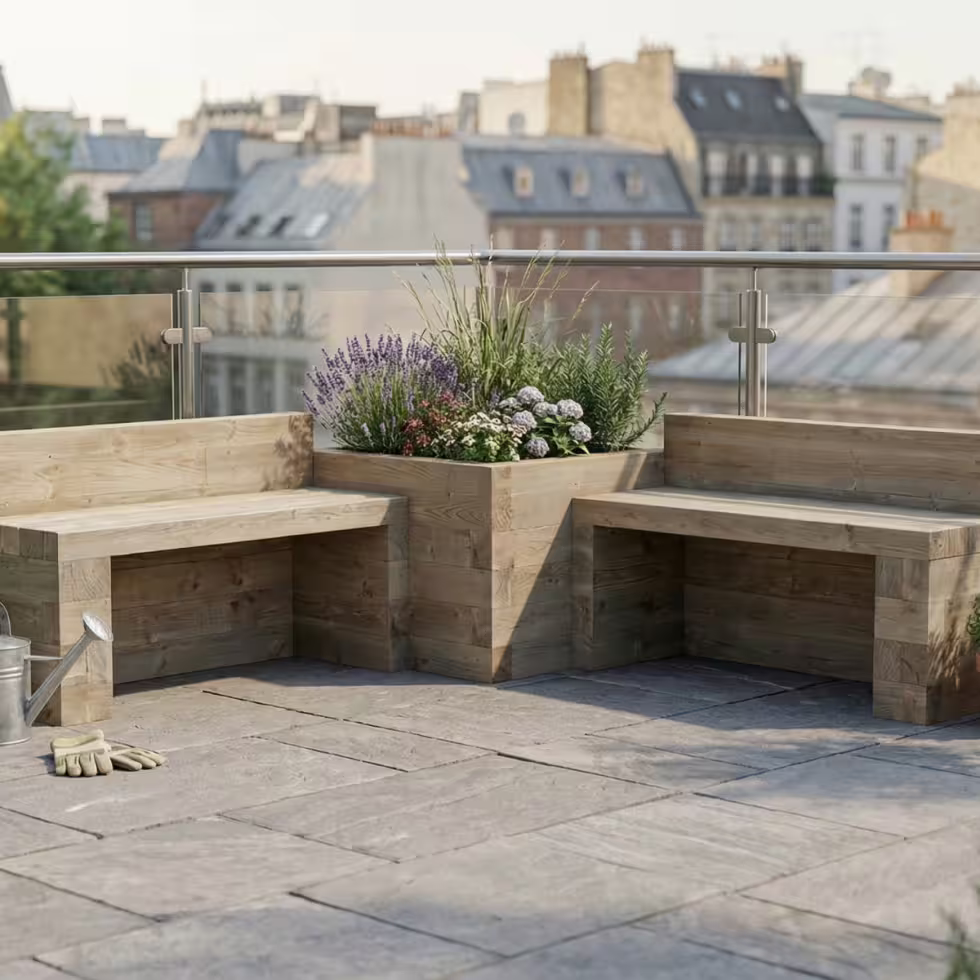 Banc de jardin avec jardinière d'angle centrale / 187,5 x 187,5 x 65 cm