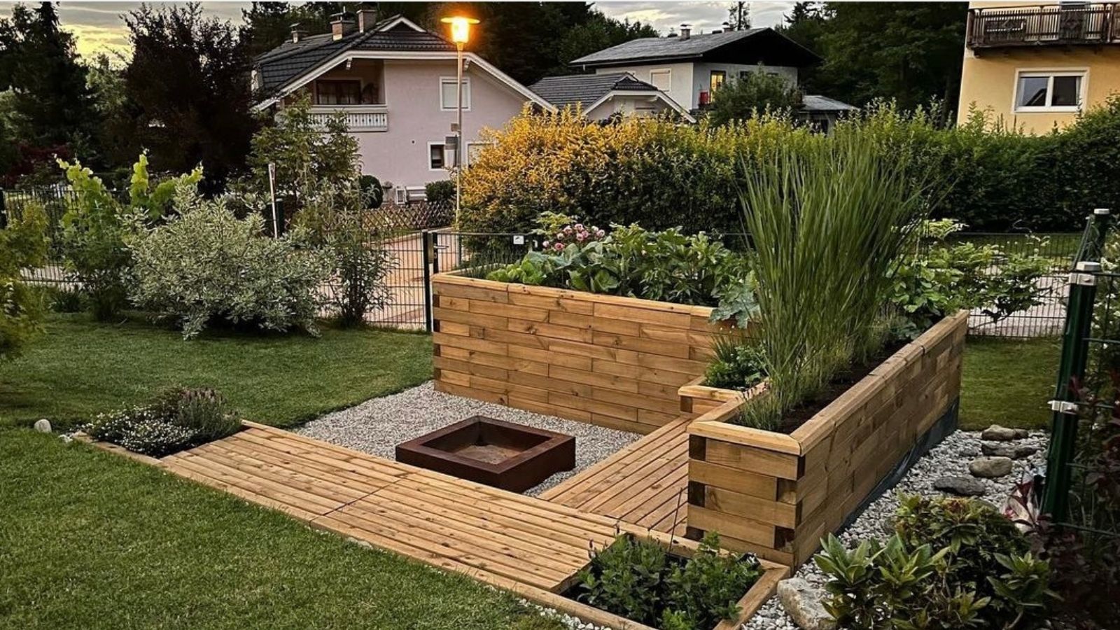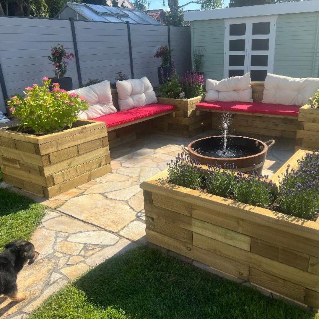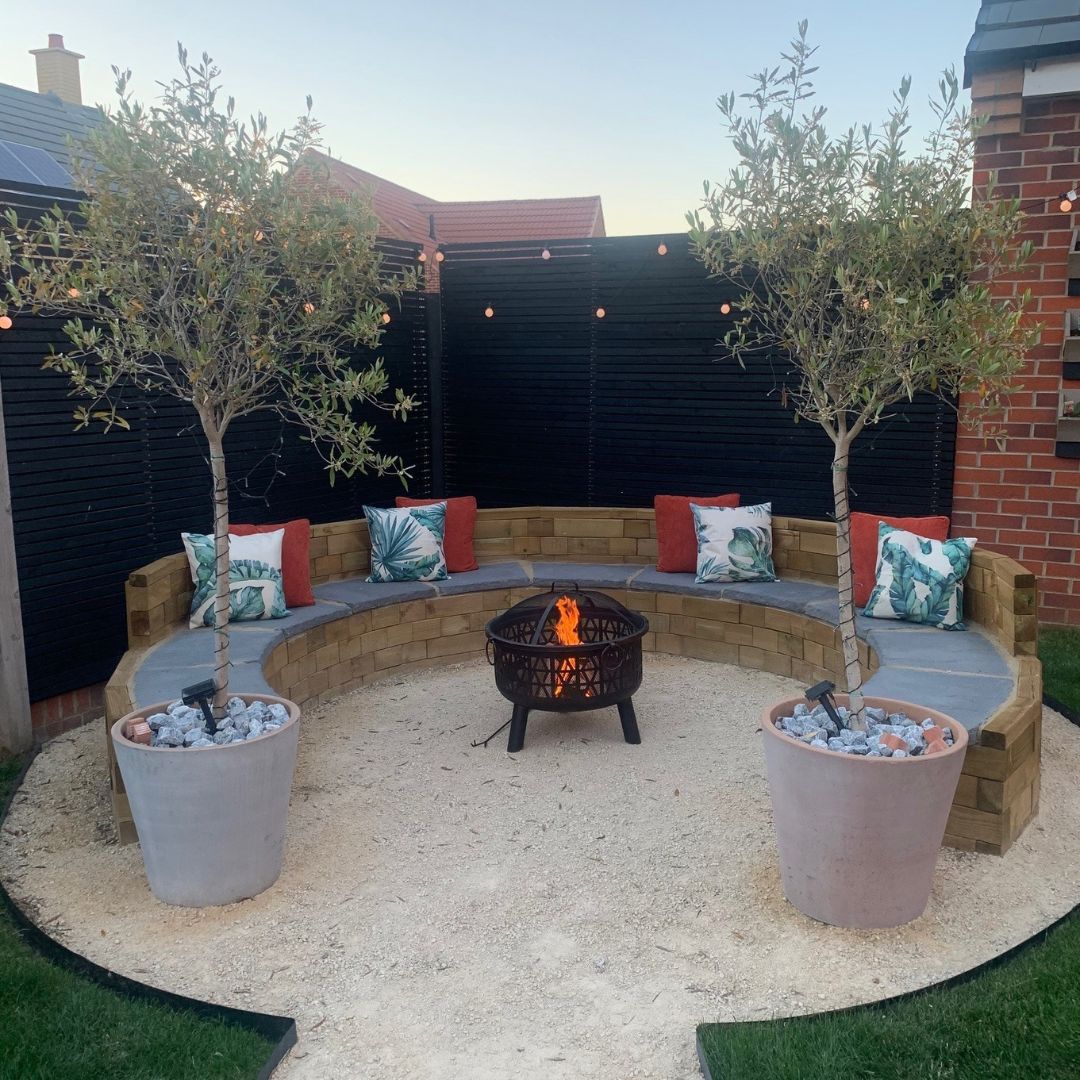 Les banquettes autour d’un brasero peuvent être petites et intimes, comme dans ce design. Si vous manquez de place, vous pouvez restreindre la superficie et ajouter des chaises et des sièges si nécessaire. Cette banquette en angle avec jardinières a suffisamment de place pour accueillir confortablement trois à quatre personnes (ou trois personnes et un chien !) et vous pourrez l’agrémenter de plantations. Créé au moyen de notre service de conception gratuit