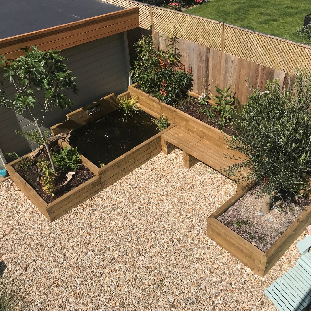 Ce design comporte de grandes jardinières, un bassin et une banquette, et tous ces éléments rassemblés forment un mini jardin. Si vous manquez d’espace ou si un coin de votre jardin a besoin d’un coup de fraîcheur, c’est une solution idéale. Créé au moyen de notre service de conception gratuit