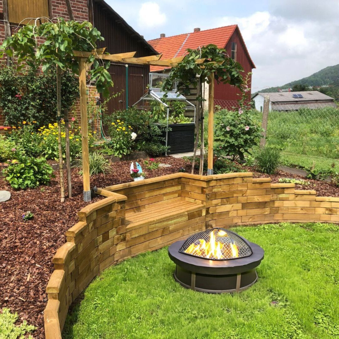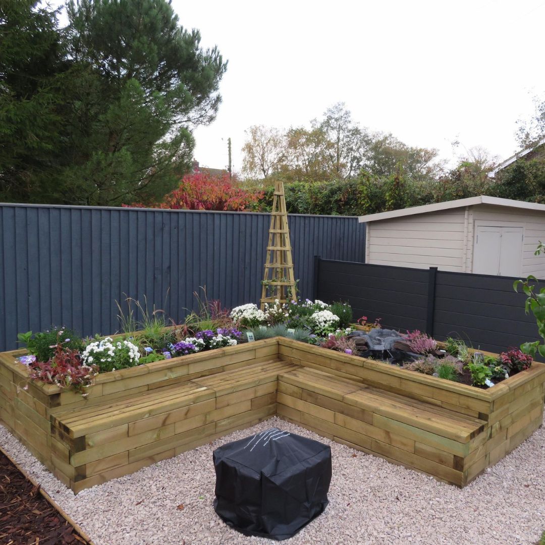 Si votre jardin est en pente, un bon moyen de maximiser l’espace et de retenir une partie du remblai est d’ajouter une structure WoodBlocX. Et si vous voulez le grand jeu, vous pouvez créer votre propre brasero enterré en creusant le sol. Notre client a ici utilisé une partie de sa banquette pour brasero afin de retenir le remblai, tout en ajoutant le reste de la structure à l’espace autour. Ce design fonctionne très bien et constitue un élément très élégant dans l’aménagement de ce jardin. Il a été créé en mélangeant les kits WoodBlocX suivants :