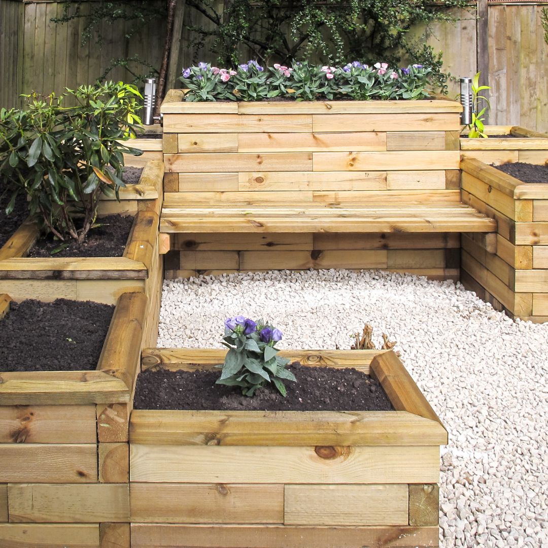 Avec WoodBlocX, il est très facile de créer des niveaux multiples. C’est une astuce idéale si vous souhaitez créer un jardin au look original ou si vous prévoyez d’ajouter des plantes de différentes tailles. Ce design présente une banquette et des jardinières en fer à cheval. Il est très facile de créer différentes combinaisons et formes avec les jardinières, grâce à la nature modulaire de WoodBlocX. Utilisez notre service de conception gratuit et nous vous créerons un design aux petits oignons !