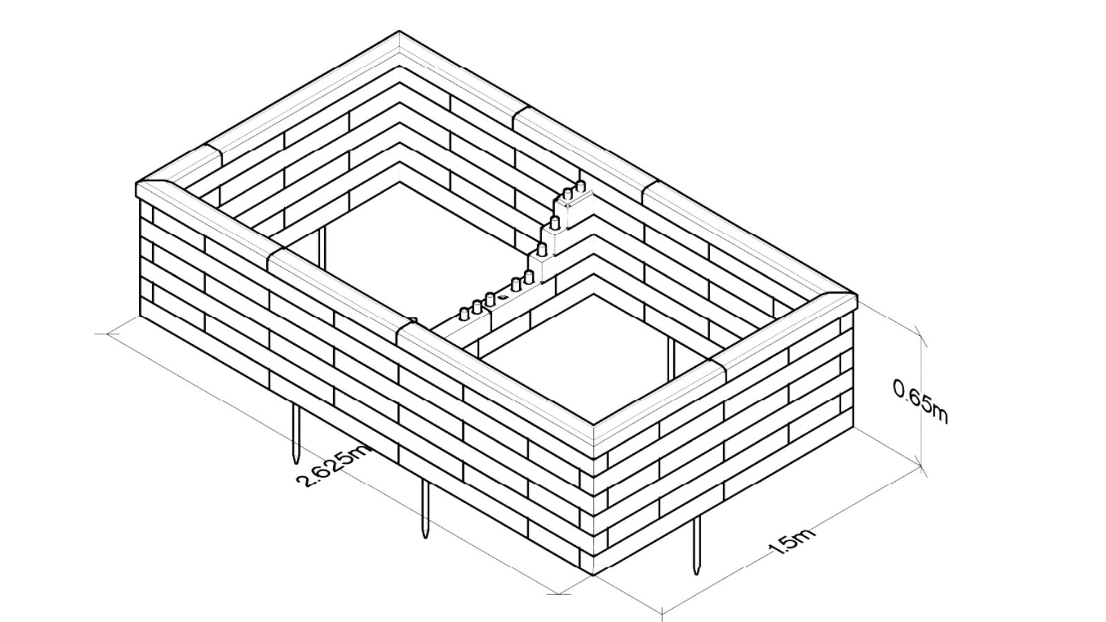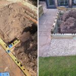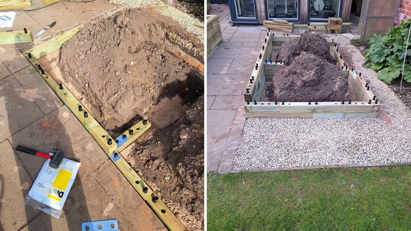 Ian a d’abord préparé le terrain en retirant les dalles pour exposer le sol meuble dessous. Avec ce type de sol, nous fournissons des tiges d’ancrage pour sécuriser la jardinière au sol. Vous pouvez construire WoodBlocX sur n’importe quelle surface : pour les sols durs comme le béton, les dalles et les terrasses, nous proposons des équerres de fixation.