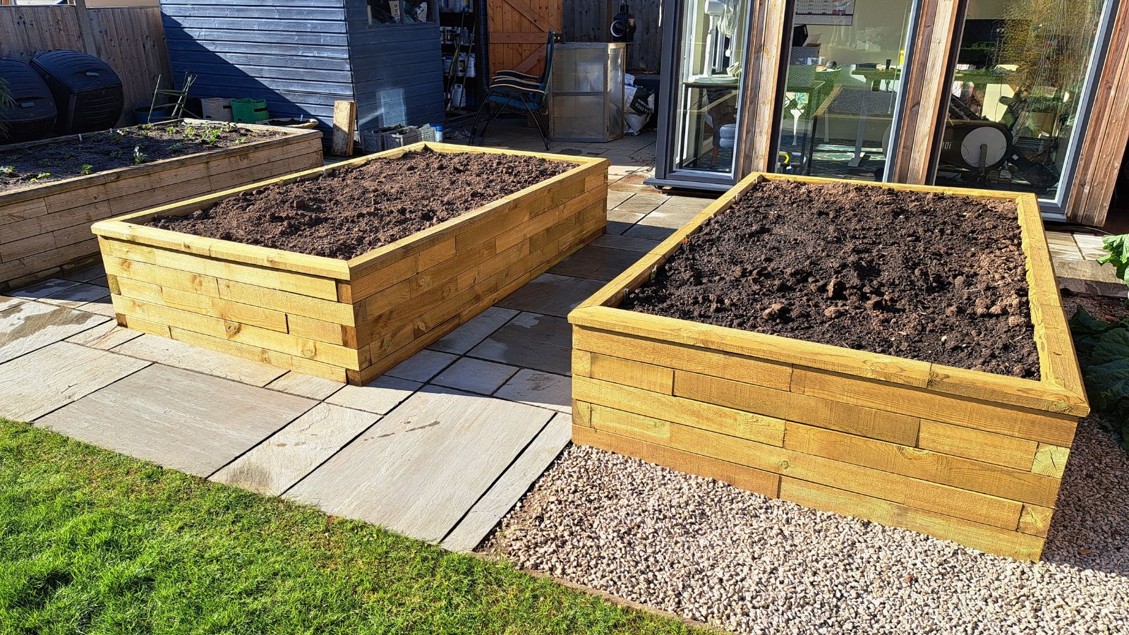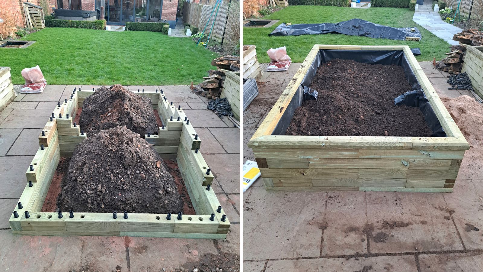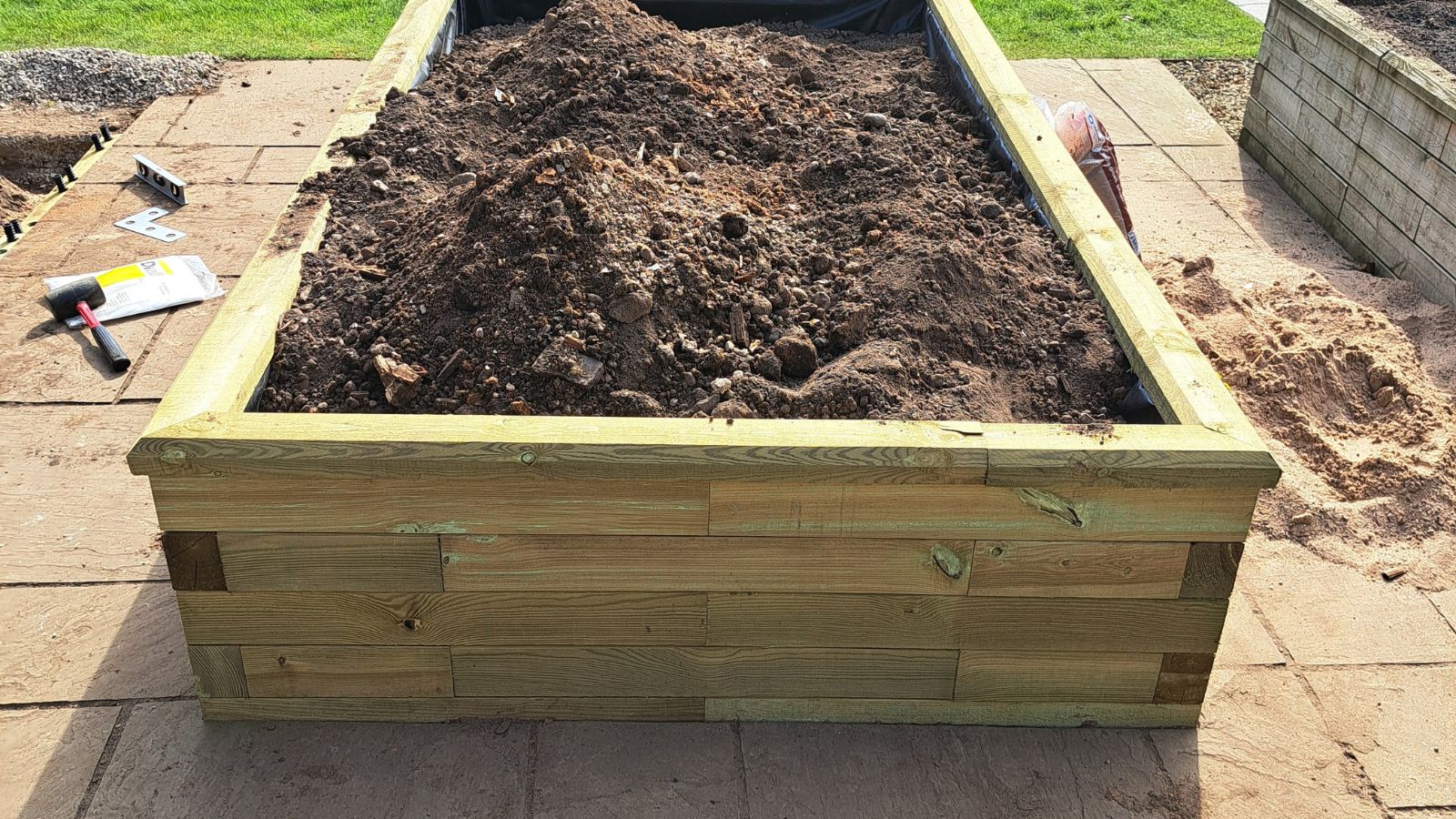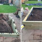 Ian a choisi notre style de rebord traditionnel pour terminer ses jardinières. Ce style est chanfreiné, possède un léger dépassement et les coins sont coupés en biseau. Vous pouvez en savoir plus sur nos styles de rebords ici. Une fois le rebord en place, Ian a rempli les jardinières de terreau, prêtes pour semer ses légumes.