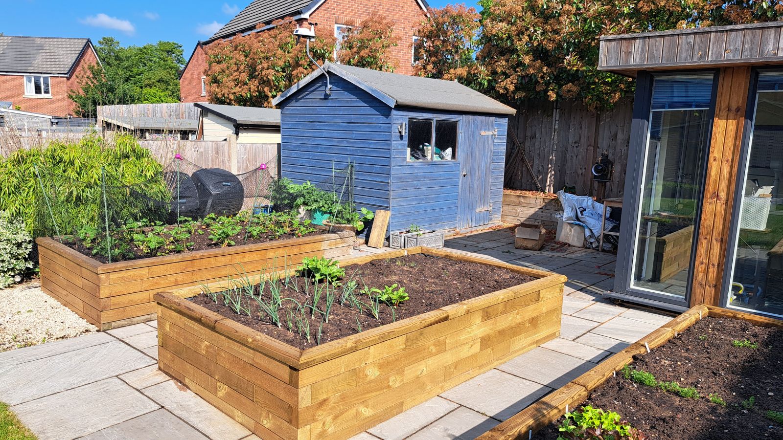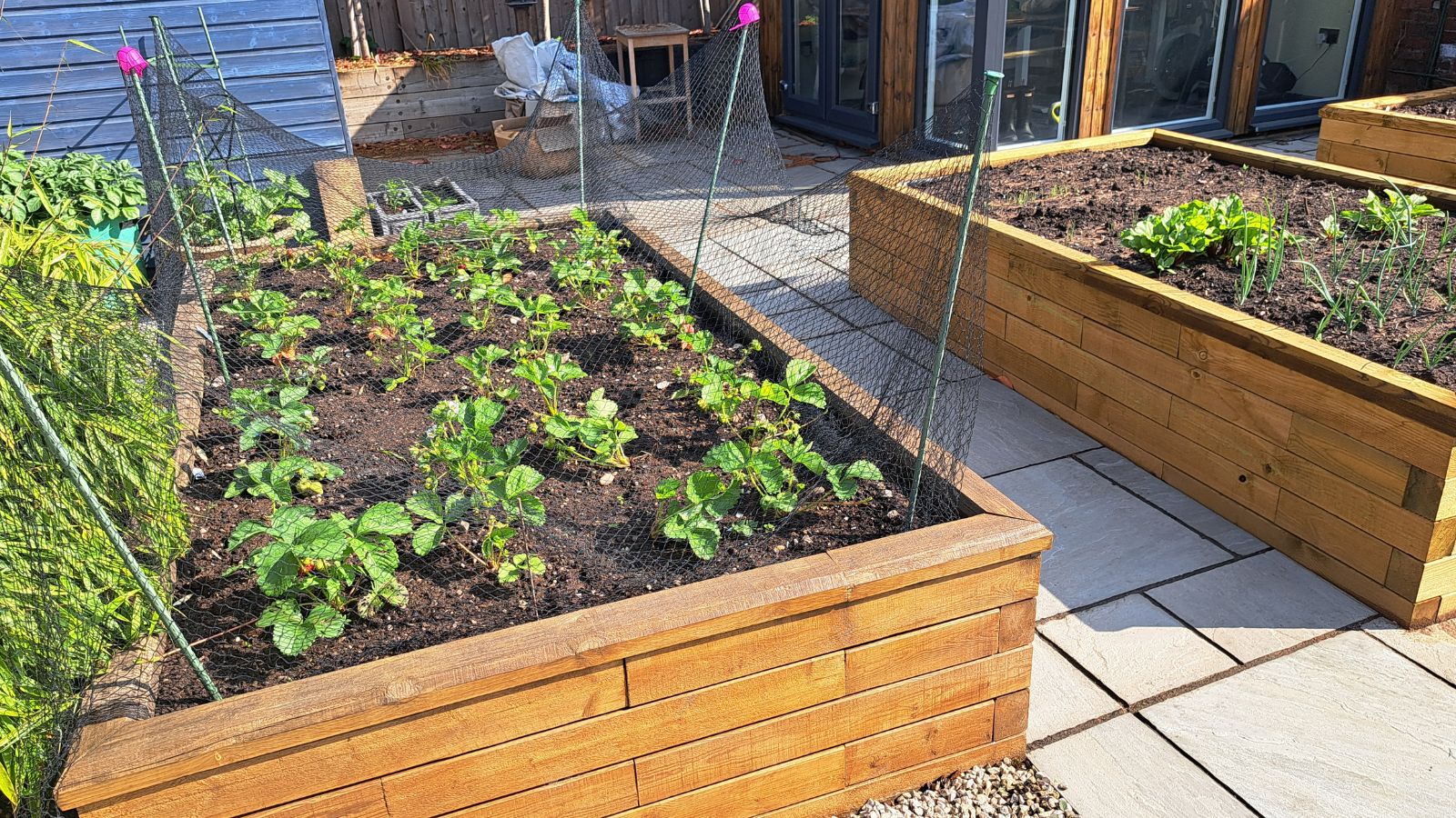 Les jardinières surélevées terminées d’Ian complètent joliment sa jardinière WoodBlocX. La jardinière existante a été revêtue d’une huile naturelle teintée pour avoir la même couleur que les nouvelles jardinières. Ce trio forme un excellent point focal dans le jardin et crée un grand espace de culture. Notre client a choisi d’ajouter des protecteurs de culture aux jardinières pour les prémunir contre les nuisibles. Vous pouvez aussi faire pousser des fleurs, des arbustes et des aromates dans nos bacs : à vous de choisir !