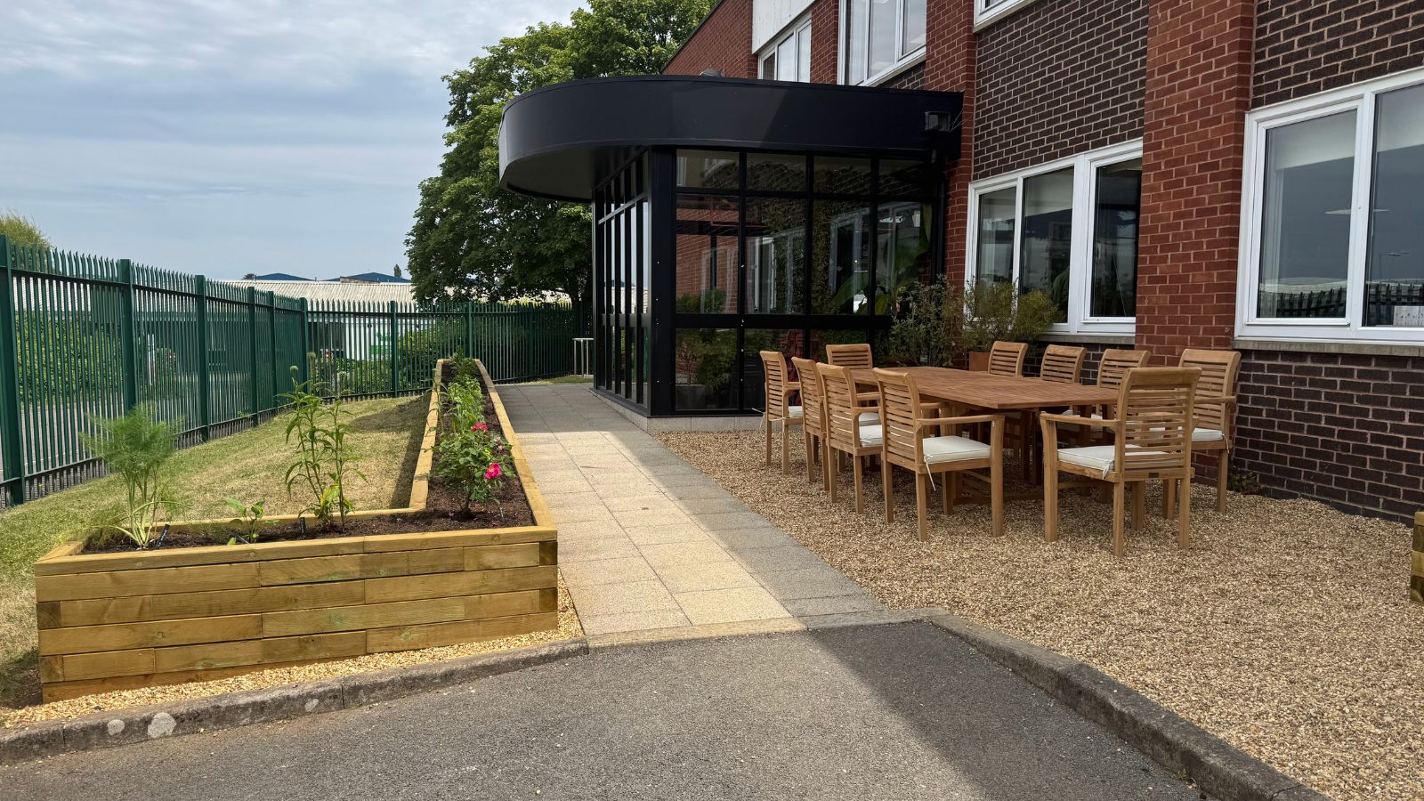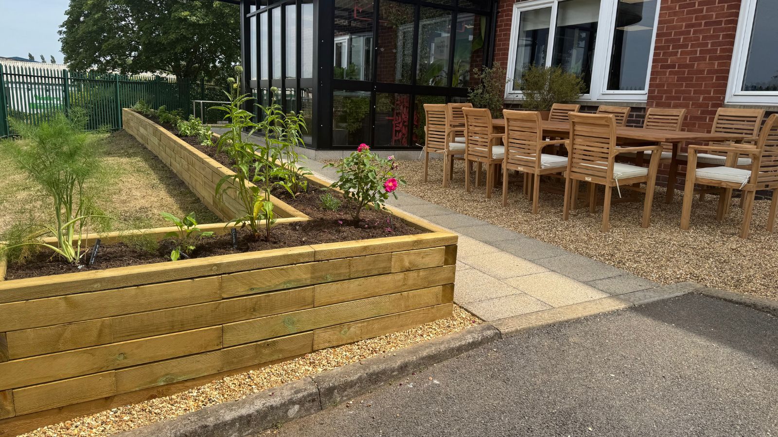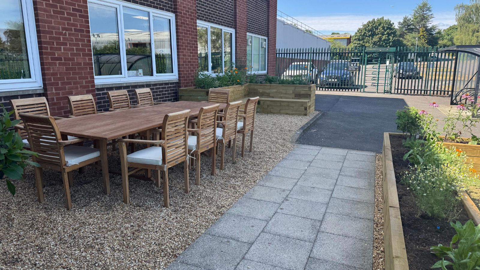 L’ajout d’une jardinière en L avec banc intégré dans le coin opposé complète parfaitement l’espace, en créant plus de place pour s’asseoir à côté de la table et des chaises. La cour extérieure est désormais un endroit attrayant pour que les collègues se retrouvent dehors.