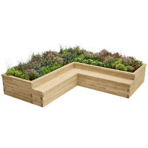 Cette grande jardinière en L avec banc intégré est une magnifique structure qui vous fournira en plus d’un coin détente, toute la place pour des plantes colorées dans un coin de votre jardin.