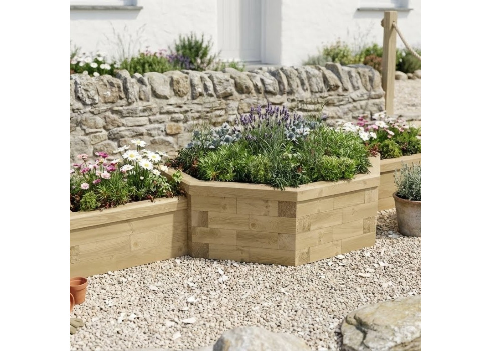 Un élément central hexagonal flanqué de deux jardinères rectangulaires, cette grande jardinière leurs peut être utilisée pour vos presentations florales, comme potager, élément central de pelouse, ou ce que vous voulez. Ajoutez de la nouveauté avec cette forme inhabituelle.