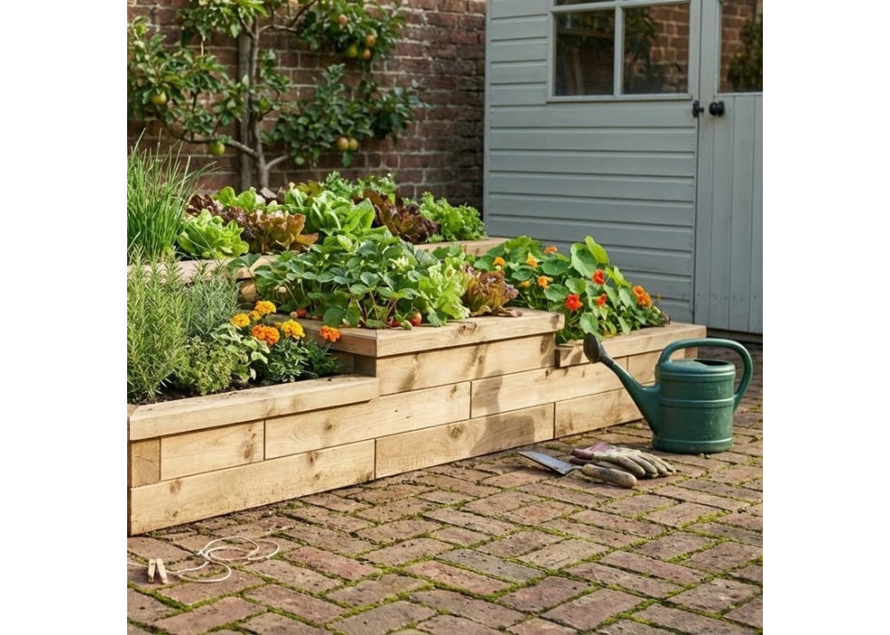 Cette configuration en terrasses comporte plusieurs sections de hauteurs différentes qui vous permettent de séparer vos herbes, légumes et fleurs tout en les gardant soigneusement rangées dans le même bac. Idéale pour les petits espaces urbains.